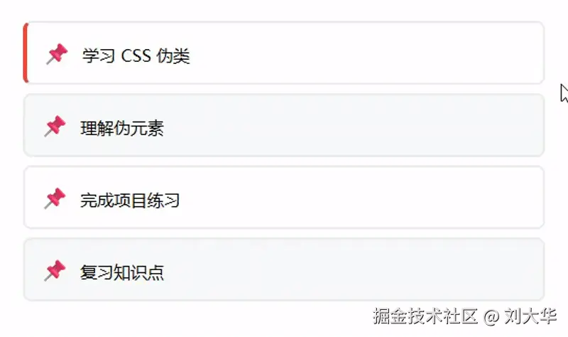 ::before:在<li>内容之前插入新内容(图标)::after:在<li>内容之后插入装饰线条::first-letter:只样式化<li>文本的第一个字母