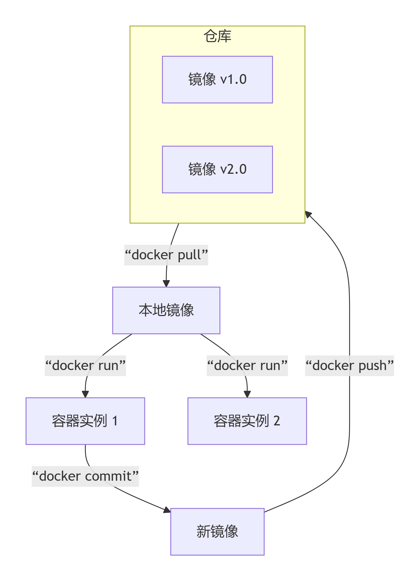 一个镜像可以创建多个容器,一个运行的容器可以提交为新的镜像,镜像在仓库和本地之间可以推送拉取。