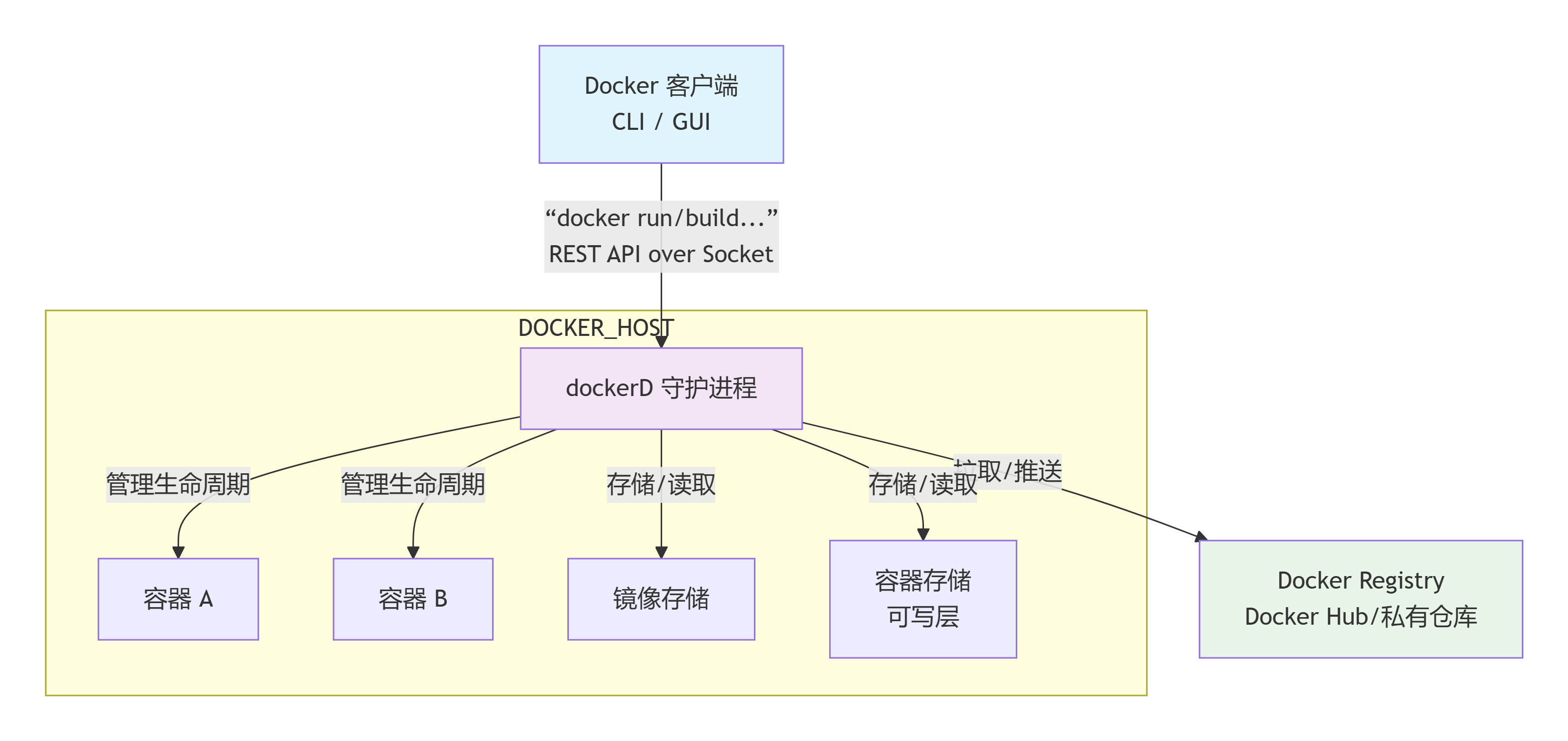 通信流程 :当你在终端输入 docker run 时,客户端通过 REST API 将指令发送给守护进程,守护进程执行操作并返回结果。