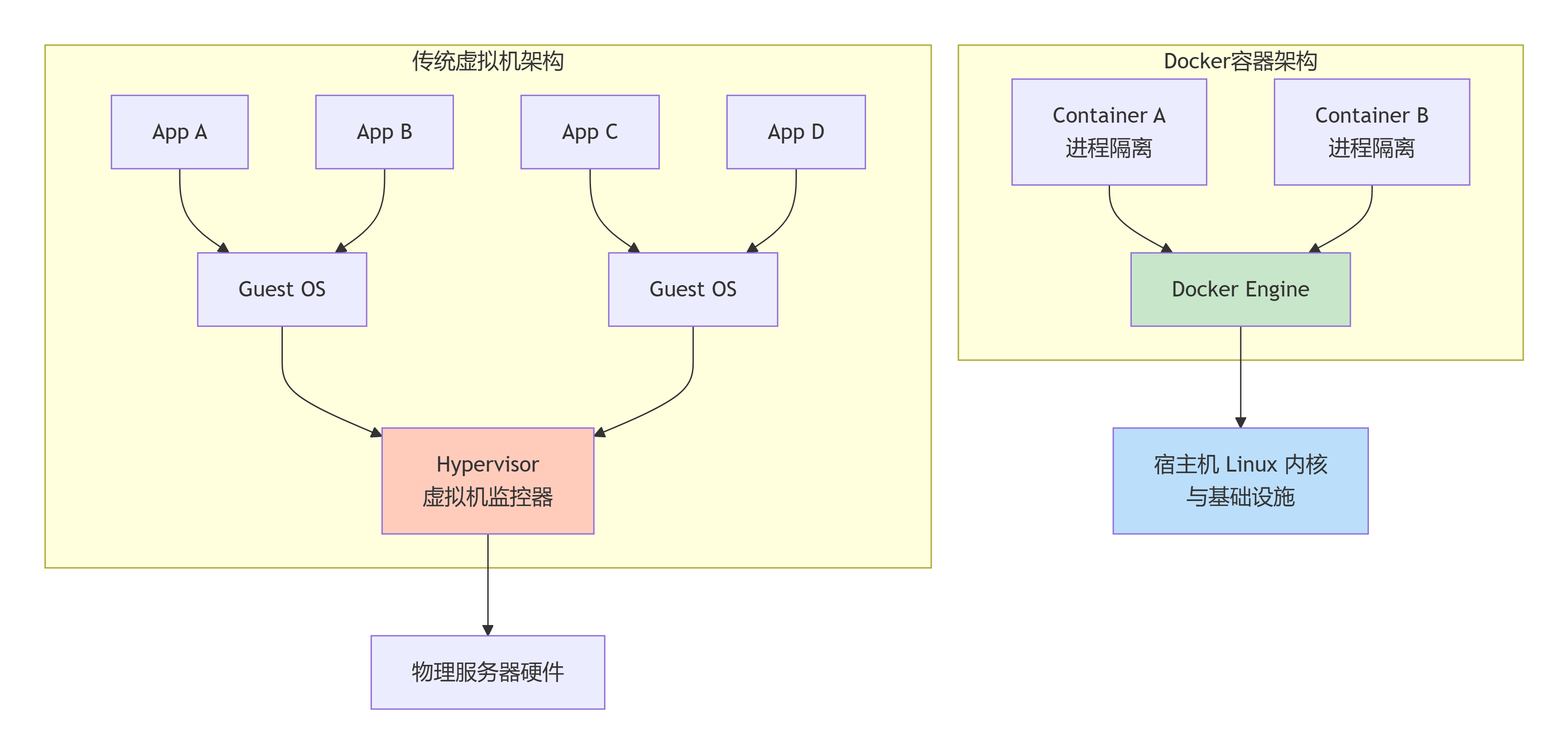 容器 :每个容器只是一个隔离的进程,直接运行在宿主机内核之上。容器内没有独立的内核,只有必要的用户空间文件和库。