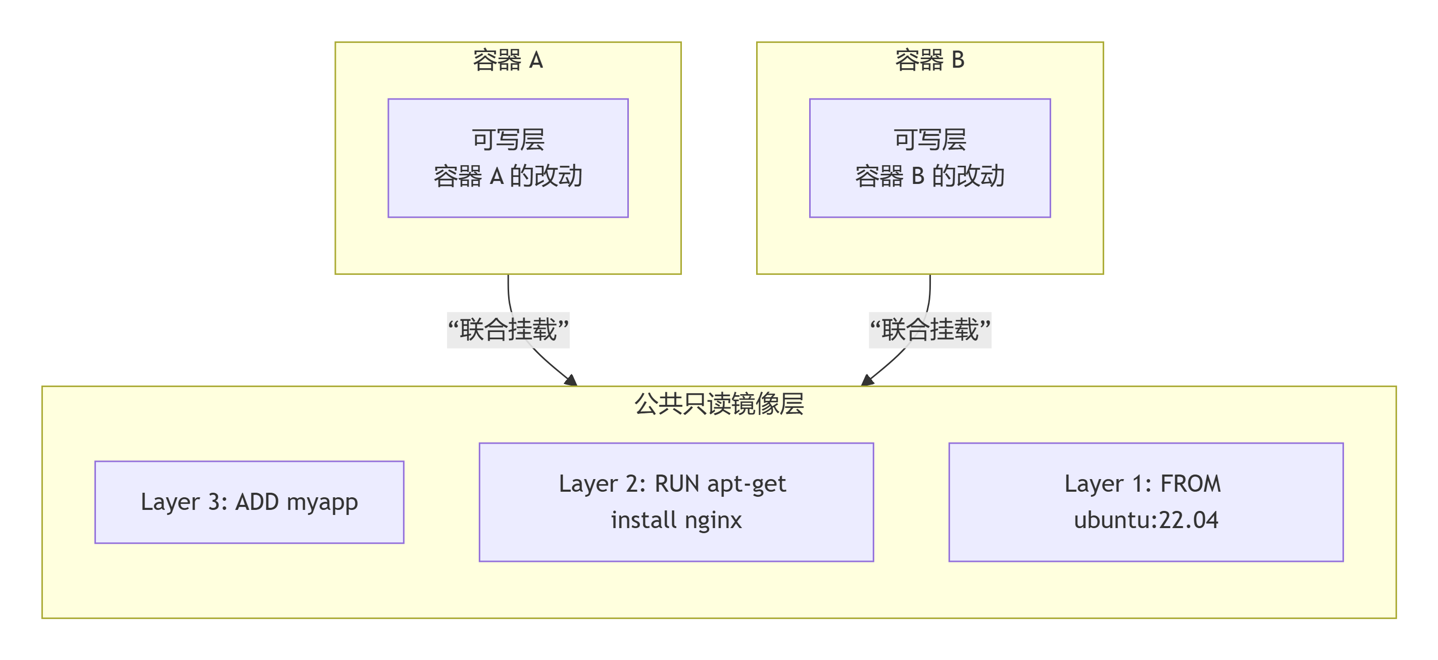两个不同的容器共享底层的只读镜像层,但拥有各自独立、互不干扰的可写层。