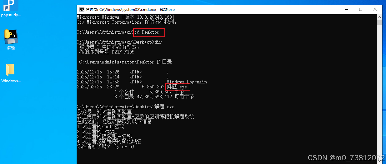 用cmd打开桌面上的解题.exe,分别输入命令: