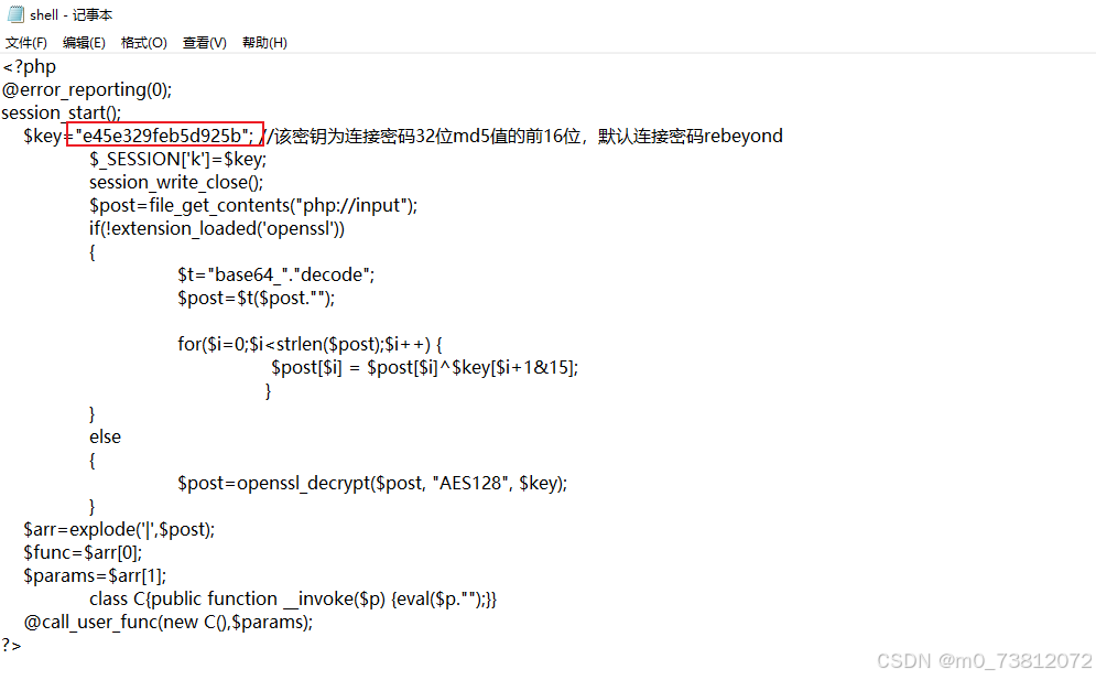 $key="e45e329feb5d925b"; //该密钥为连接密码32位md5值的前16位,默认连接密码rebeyond