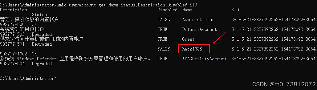 wmic useraccount get Name,Status,Description,Disabled,SID
