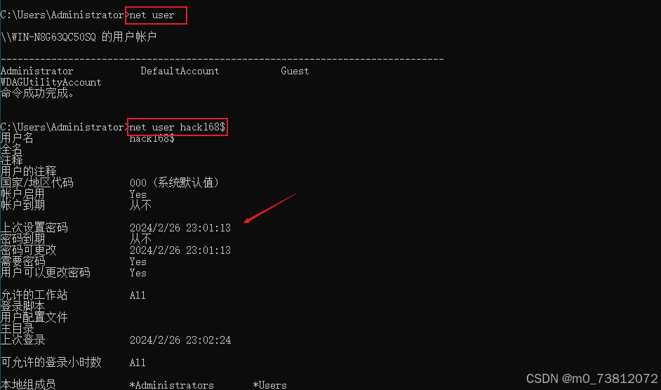请输入攻击者的隐藏账户名称:hack168$