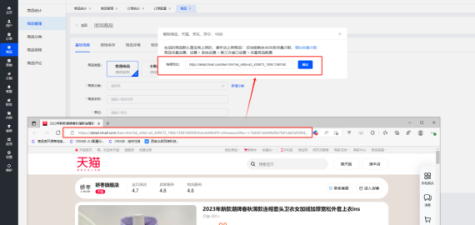 完成第一步商品采集接口配置后,点击"商品采集"按钮,将第三方平台(采集接口支持的电商平台)商品链接复制到链接地址中,点击确定后;系统会自动识别商品信息并填充。使用者检查无误后可添加商品