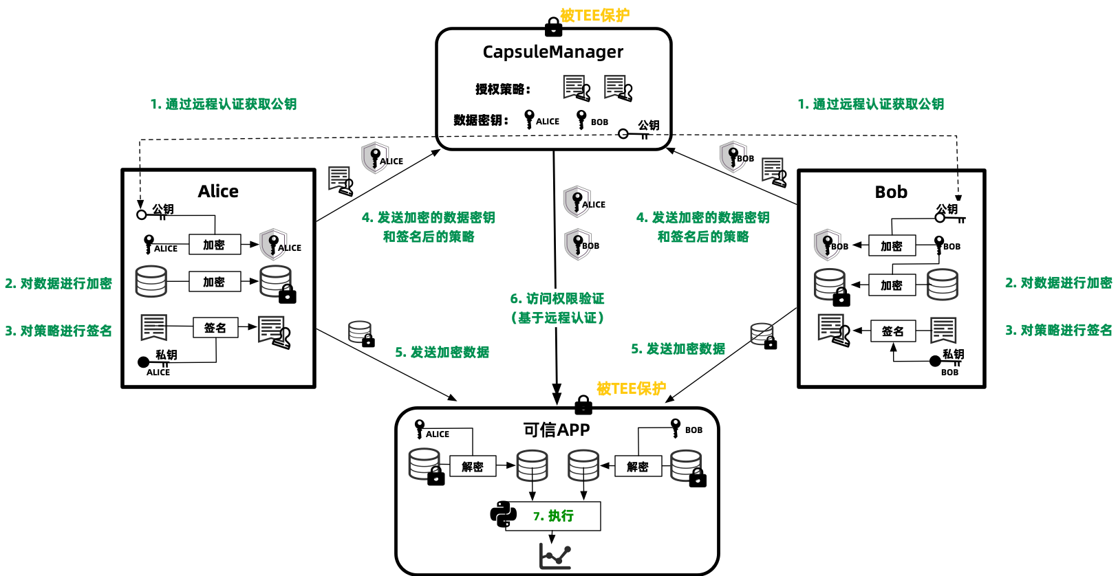 数据持有方(图中以alice和bob为例)对CapsuleManager(运行在TEE中)进行远程认证,确认CapsuleManager被正确部署在TEE环境中,且代码未被篡改。CapsuleManager的公钥会随着远程认证报告一起返回给数据持有方。