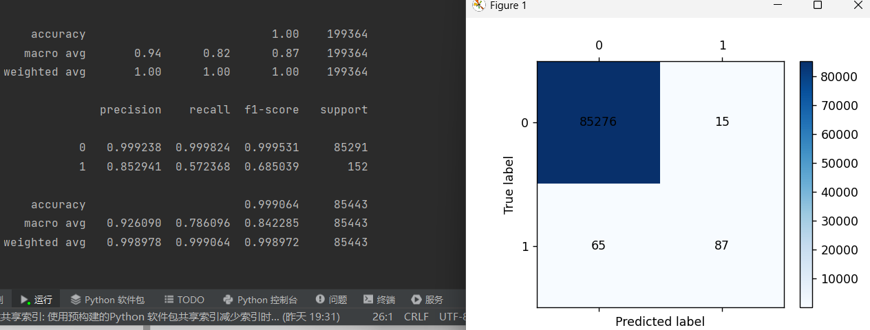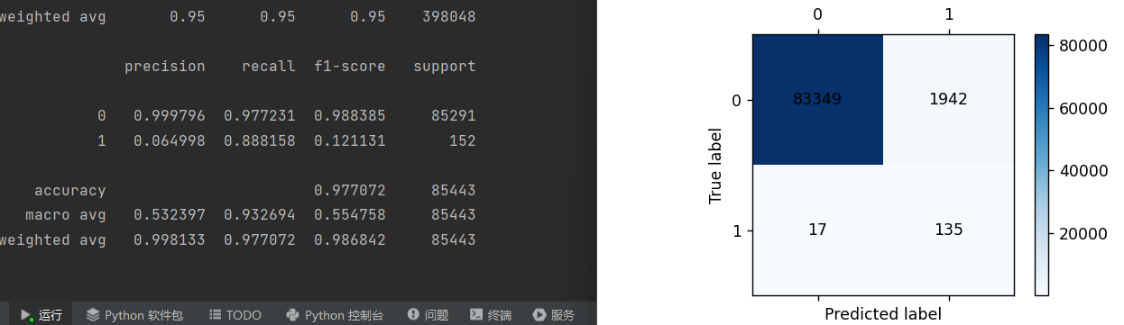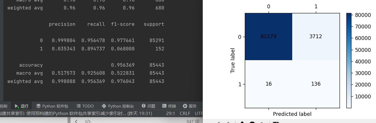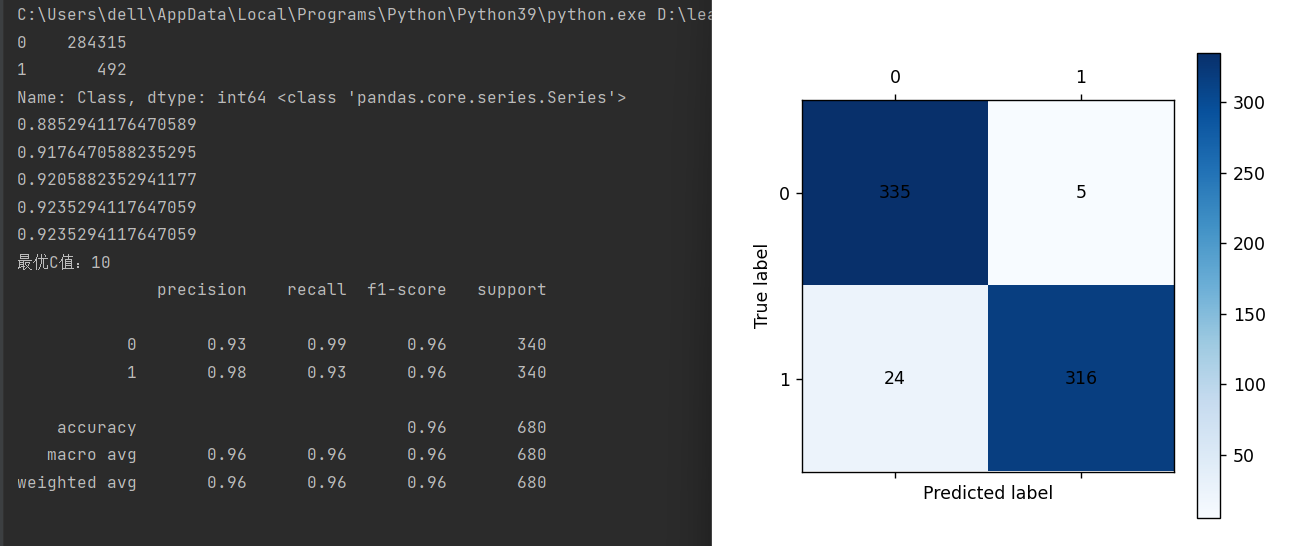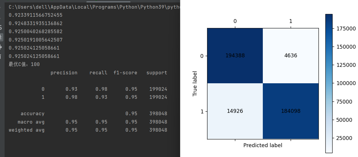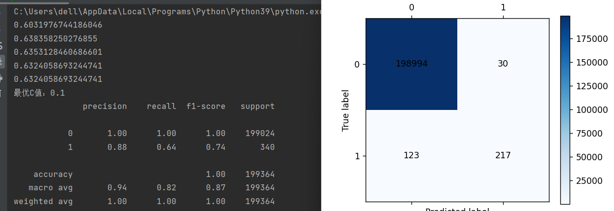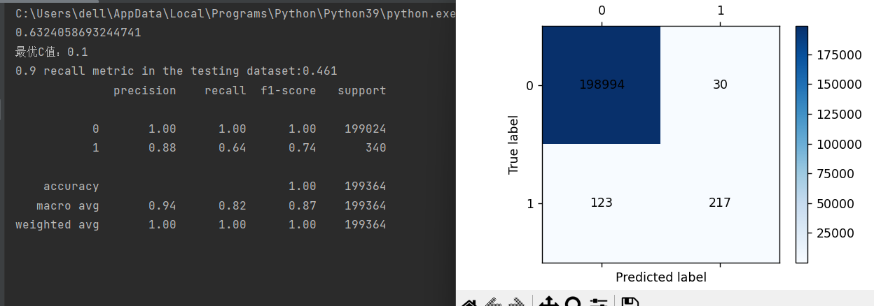 和上篇博客中代码用同样的数据但是更改了c值并找到了最优c值,训练召回率和预测召回率都提升了。