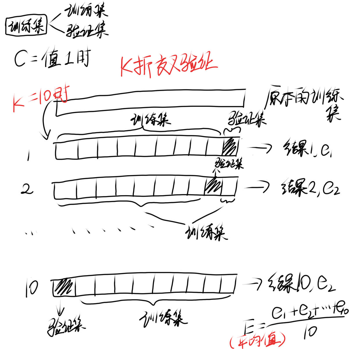 k取值多少我们就把原来的训练集分为几份,c取某个值的时候每一份依次做验证集,这样就保证了分出去当验证集的数据也能当训练集训练模型,分成几份就会得到几个结果,把结果求平均值就可以作为该c值下的结果