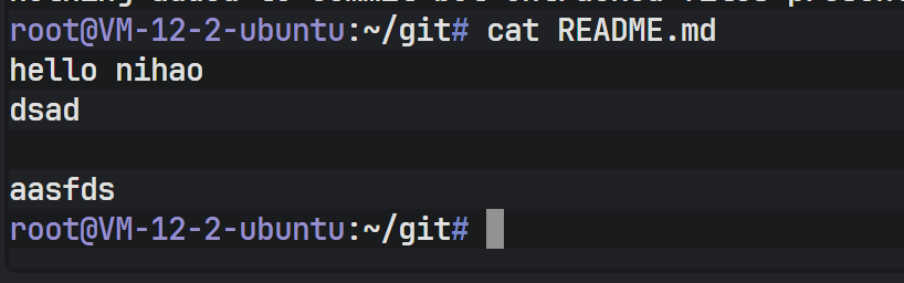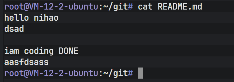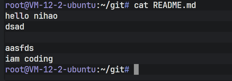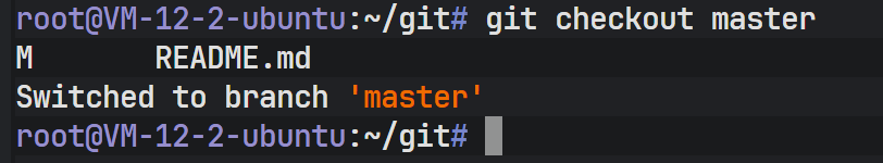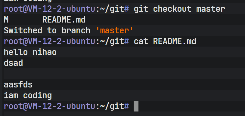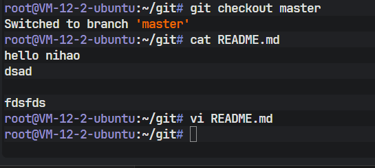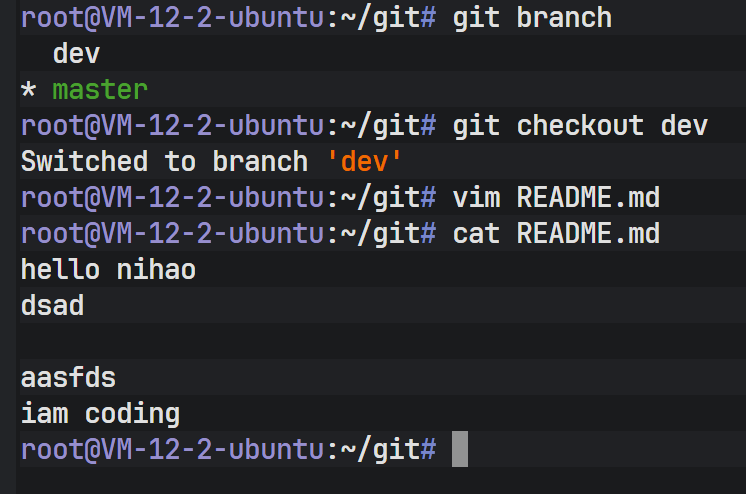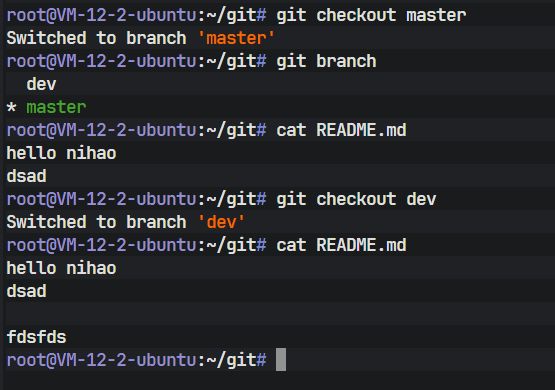 切换回 master 后,查看 README 文件,可以发现之前在 dev 分支上新增的代码消失了。这是因为 Git 在切换分支时,会自动更新工作区的文件以匹配目标分支(这里是 master)所指向的提交快照。