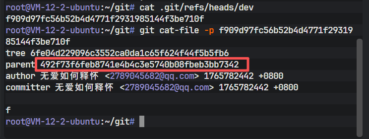 上图通过 cat-file 命令解析了 dev 分支指向的提交对象。可以看到,该提交对象包含了一个 parent 字段,该字段的值正是 master 分支目前所指向的哈希值。这证明了 dev 是基于 master 衍生并向前推进的。