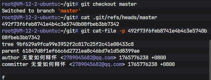 此时,虽然创建了新分支,但 HEAD 指针并未发生移动。通过查看 .git/HEAD 文件可以验证这一点: