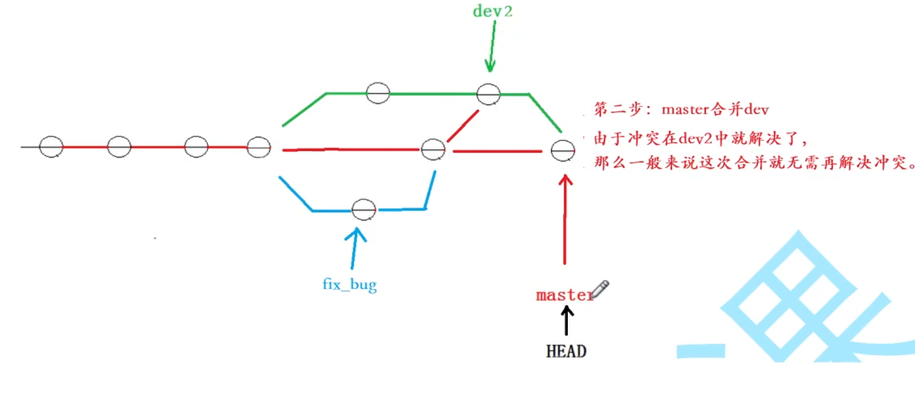 关键问题 :此时 master 包含了 Bug 修复的代码,而 dev 是从旧的 master 分出来的,且包含了新功能。如果此时直接将 dev 合并入 master,可能会覆盖掉 Bug 修复的代码或产生冲突。