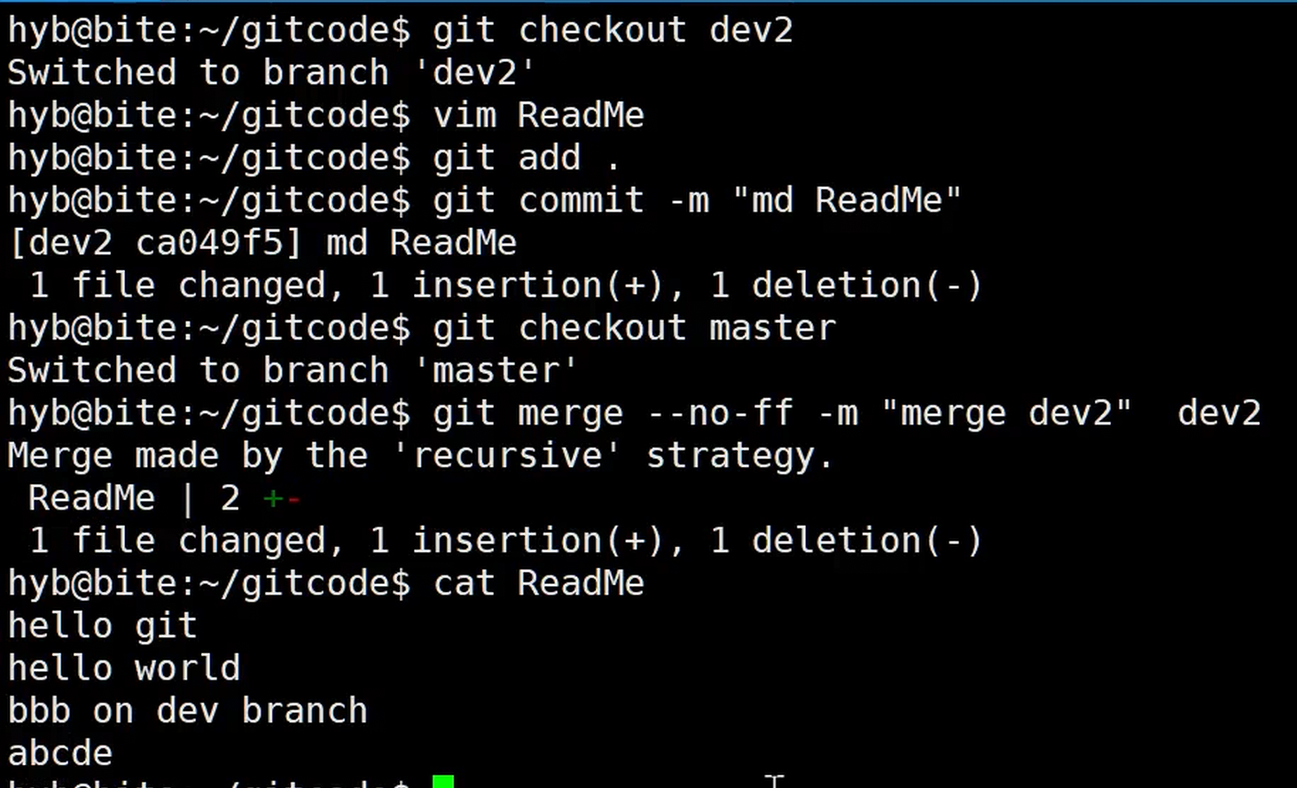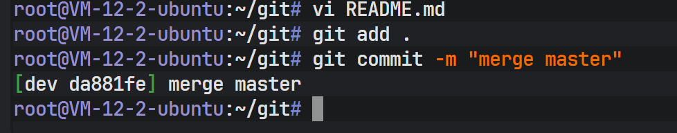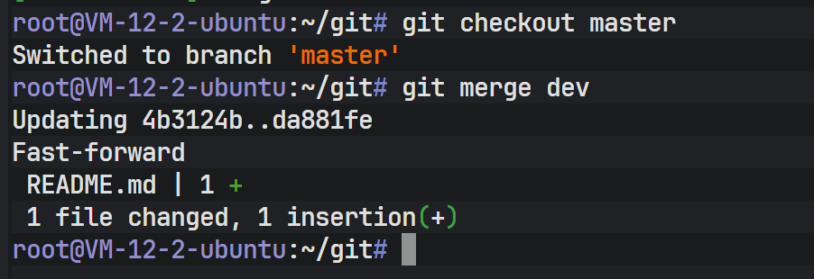 现在 dev 分支既包含了新功能,也包含了 master 的 Bug 修复。最后,切换回 master,合并 dev。