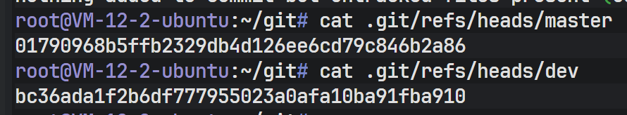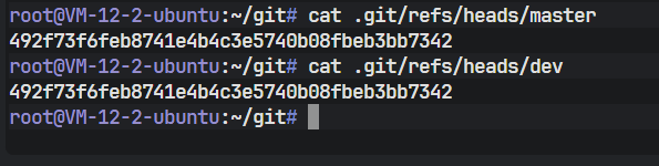 在 .git/refs/heads/ 目录下,现在出现了两个文件:master 和 dev。这两个文件的内容是什么关系呢?