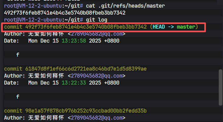 上图清晰地展示了提交历史,其中 HEAD -> master 的标识印证了 HEAD 指向 master,而 master 指向该次提交记录的逻辑关系。