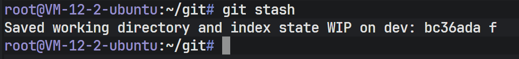 为了安全起见,先切回 dev,使用 stash 功能将当前工作区的状态"冻结"并存储起来。