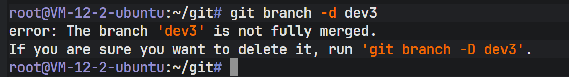 Git 会报错阻止删除,提示该分支包含未合并的工作("not fully merged")。这是 Git 的数据保护机制,防止误删导致代码丢失。