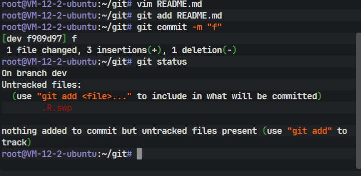 完成修改后,执行 git add 和 git commit 将更改提交到版本库。此时,dev 分支向前移动了一步,拥有了新的哈希值,而 master 分支仍指向旧的提交。
