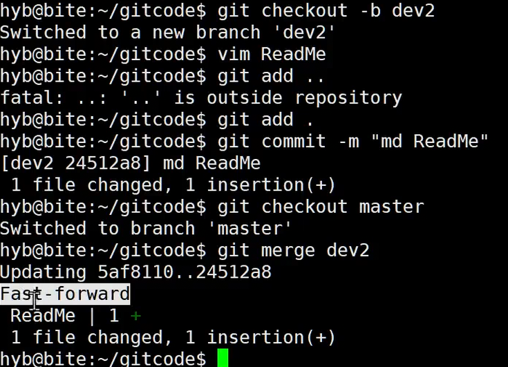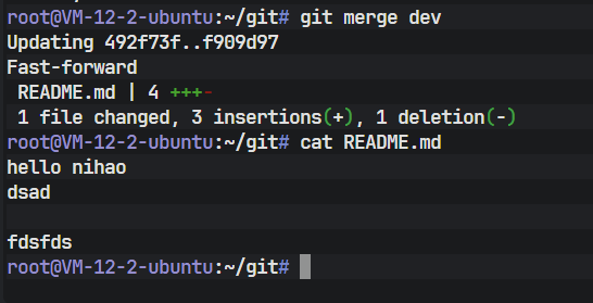 上图的输出结果中出现了 Fast-forward 字样。这代表了"快进模式"合并。由于 master 分支在 dev 分支创建后没有任何新的提交,它是 dev 分支的直接祖先。因此,Git 不需要执行复杂的合并计算,只需简单地将 master 指针"向前滑动"到 dev 指针的位置即可。