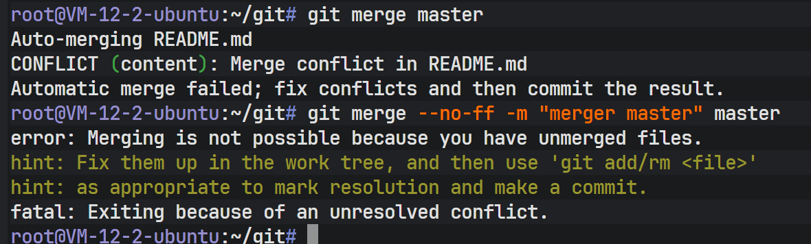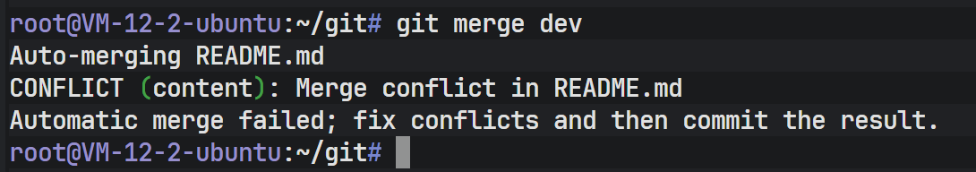 上图显示 Auto-merging README 失败,提示 CONFLICT (content),要求用户手动解决冲突后再提交。