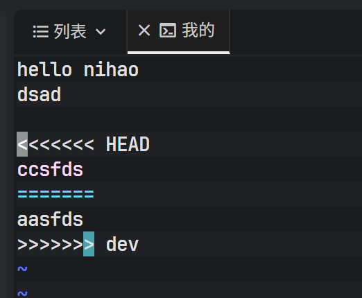 <<<<<<< HEAD:表示当前分支(master)的修改内容。=======:分割线。>>>>>>> dev:表示待合并分支(dev)的修改内容。