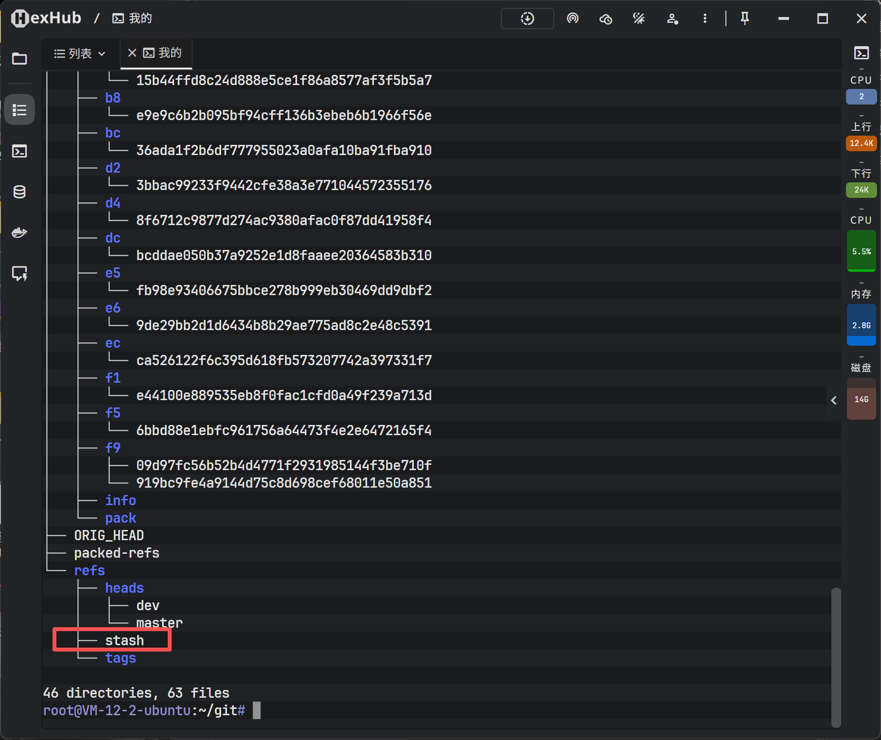 执行 stash 后,查看 .git 目录,会发现新增了 refs/stash 文件,专门用于存储这种临时状态。