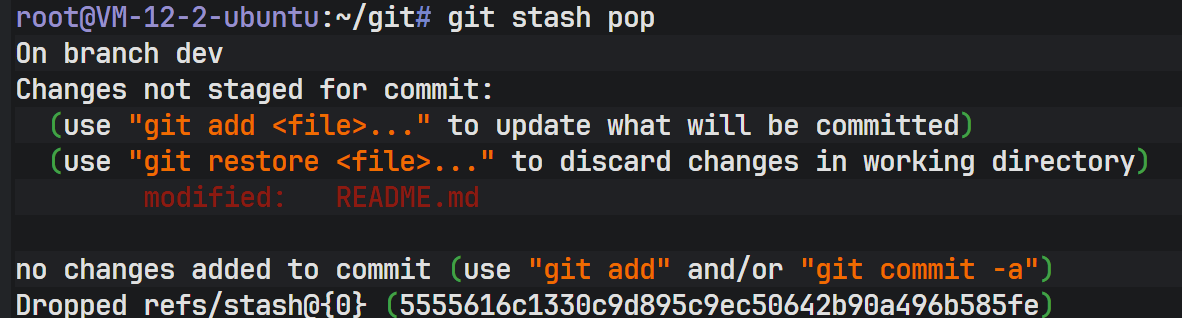 git stash pop 会恢复之前保存的工作区内容,并同时删除 stash 列表中的记录(若只想恢复不删除可使用 git stash apply)。