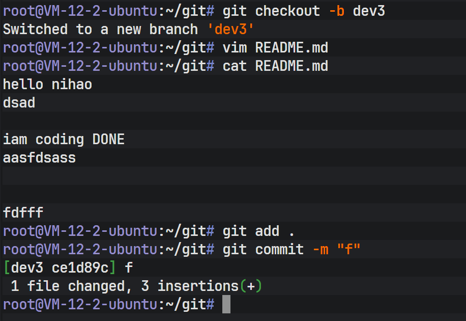 创建一个测试分支 dev3 并提交修改:
