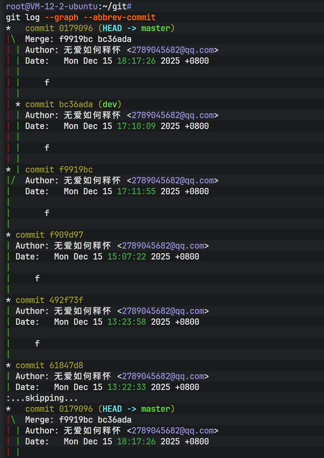上图展示了一个清晰的"气泡"结构,即便删除了 dev 分支,历史记录中依然可以清晰地看到这段并行开发的轨迹。