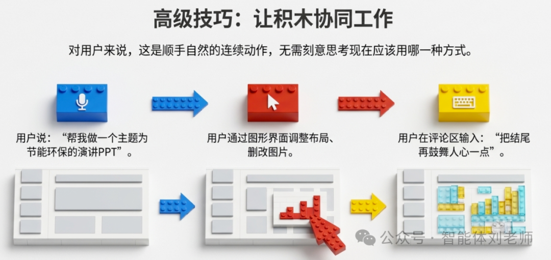 这三个步骤用的是三种不同交互方式,但对智能体来说是一个连贯的任务,对用户来说则是顺手、自然、无需刻意思考"现在应该用哪一种方式"。