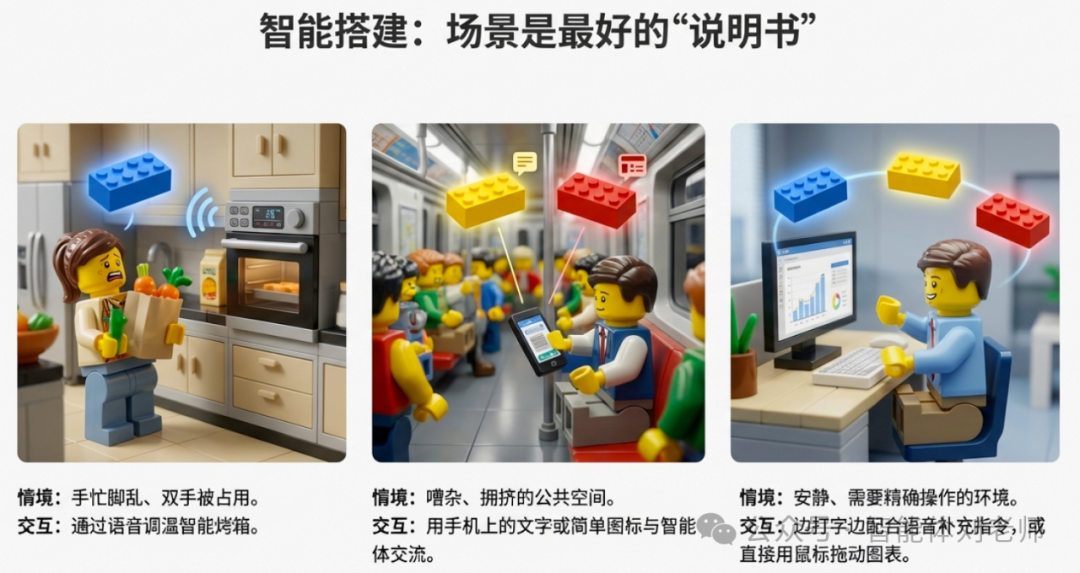 以任务为中心、以场景为边界、以用户习惯为约束,构建一个 语音 + 文字 + 图形 +(必要时再加手势、触觉等) 的自适应交互系统。