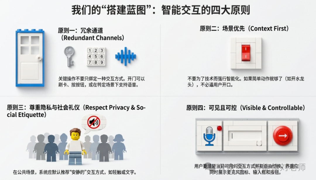 尊重隐私与社会礼仪:在人多的地方、公共场景中,系统应默认推荐"安静的交互方式",如轻触、手势、小窗文字,而不是要求用户"对着设备喊话"。