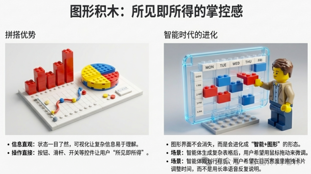智能体帮你规划了一天的行程,你希望在日历界面里拖拽卡片调整时间,而不是用一长串文字或语音反复说明"小助手,把下午三点的会议改到四点,把晚饭提前半小时......"。