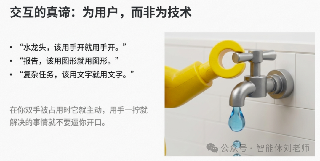 智能体的"聪明",不只是能听懂人话、能写文章、能规划任务,更体现在它懂得在合适的时间用合适的方式跟你"说话"------在你需要沉默时就安静,在你双手被占用时就主动,用嘴说话合理时就支持语音,用手一拧就解决的事情就不要逼你开口。