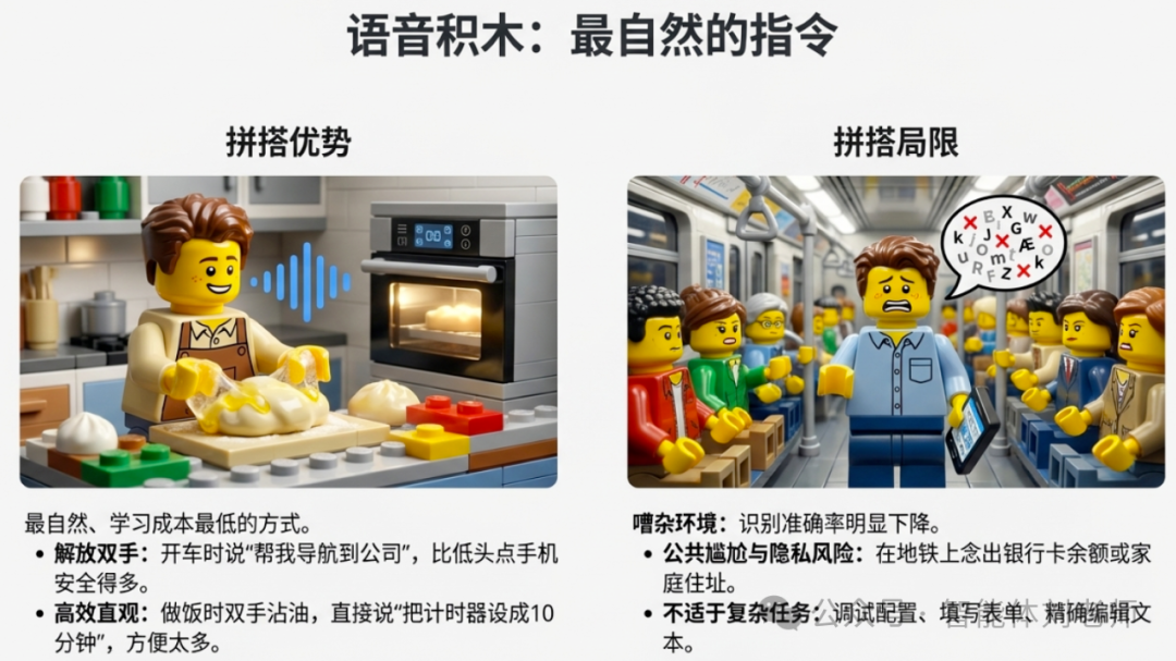 但如果只崇拜语音,很快就会发现问题遍地都是。嘈杂环境中,语音识别的准确率会明显下降;在人多的地方,用嘴"对设备说话"会让人感到尴尬,甚至有隐私风险------比如在地铁上念出银行卡余额、家庭住址等内容。还有一些任务本身就不适合语音,例如调试一段复杂配置、填写表单、精确编辑文本,这些更适合用文字或图形界面完成。你提到"打开水龙头没必要用嘴说话",就是一个典型例子:这个动作更符合"顺手一拧"或"用感应自动出水"的习惯,而不是"对水龙头说话"。