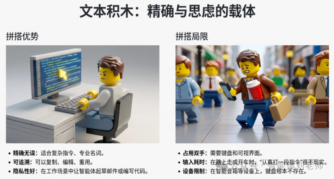 文字:适合"需要精确表达与记录"的情境------复杂任务、多轮对话、需要拷贝或存档的内容。
