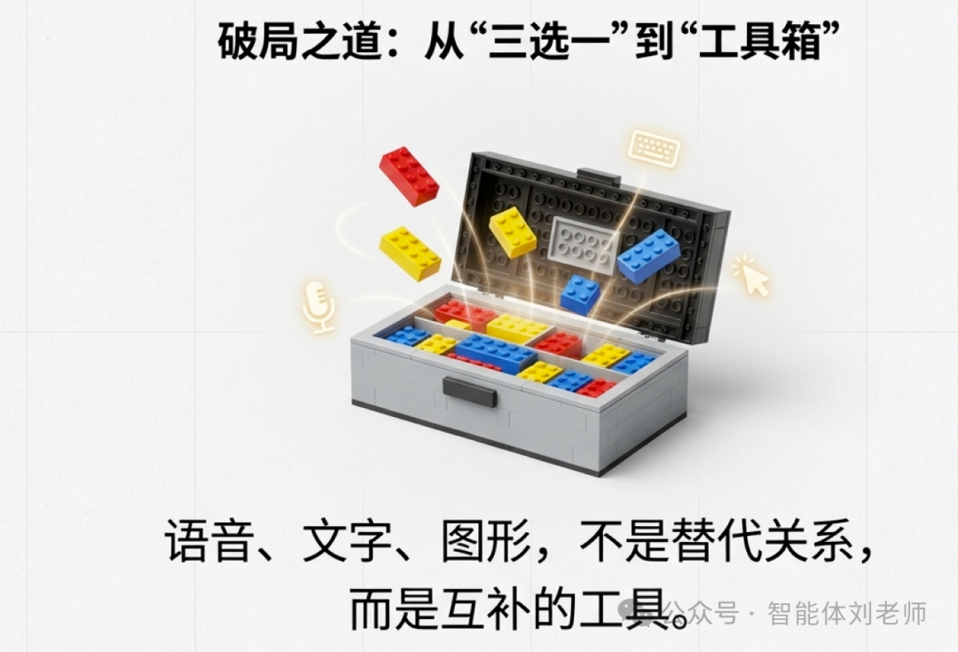 智能体时代的交互不应该站在"语音 vs 文字 vs 图形"的对立面,而应该站在用户这边,视它们为一组工具箱。