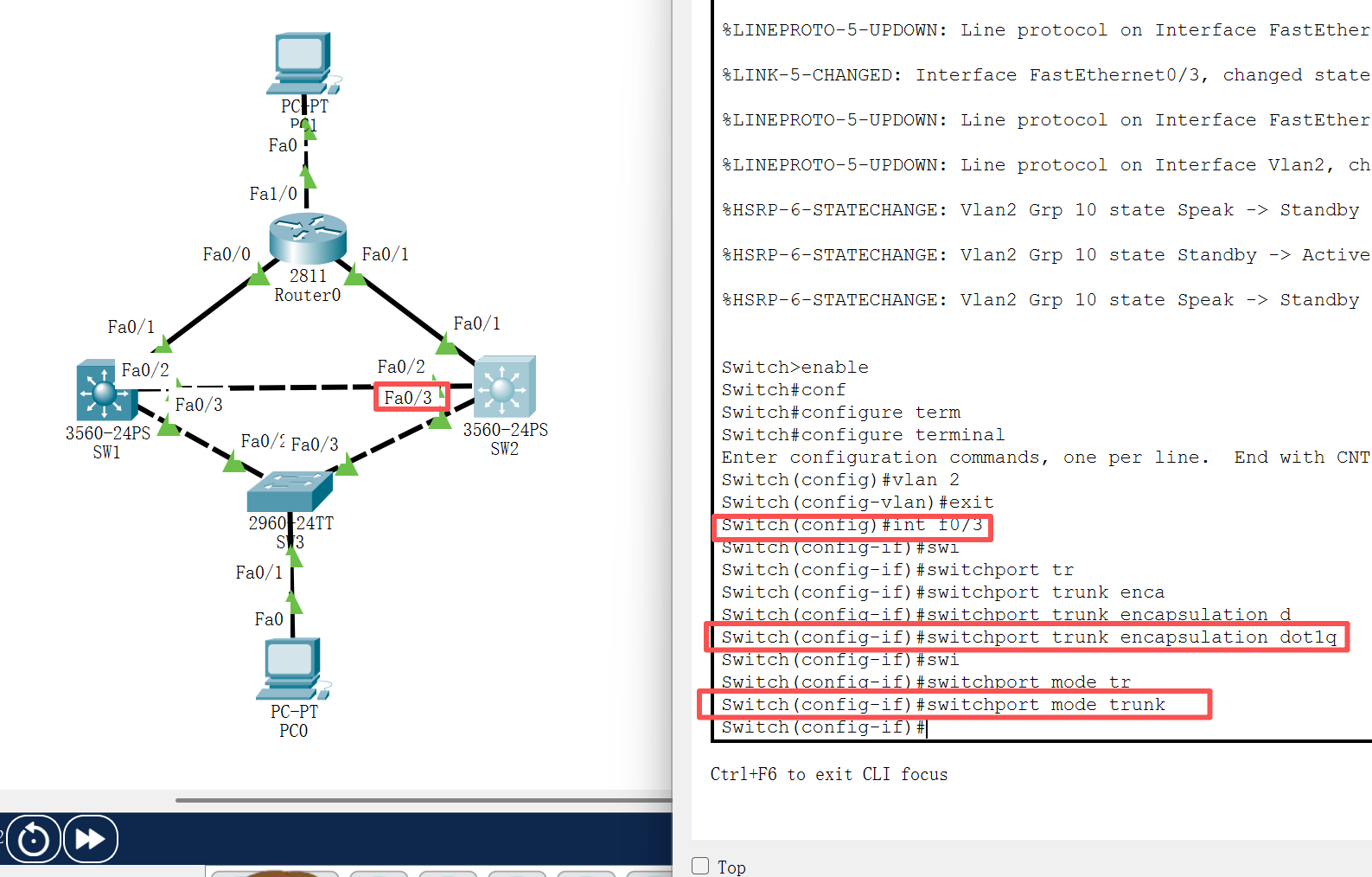 配置SW1的f0/3接口为trunk模式并指定封装方式dot1q
