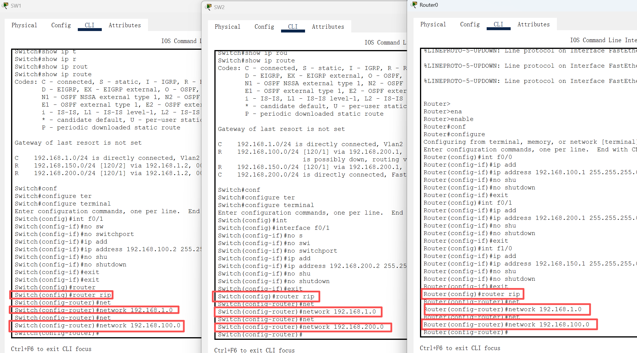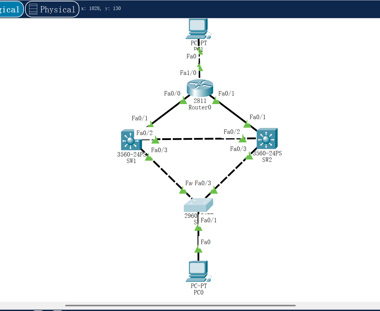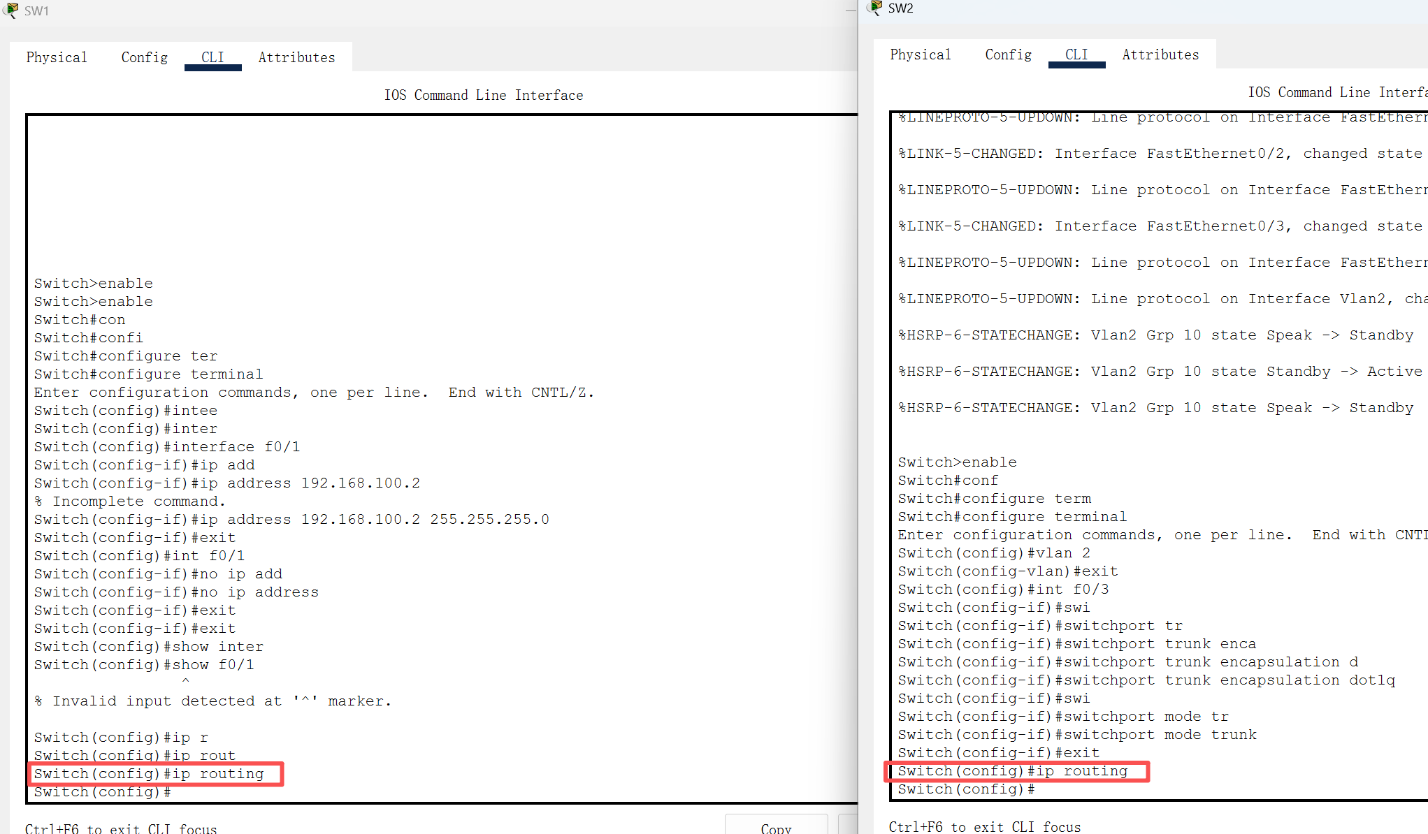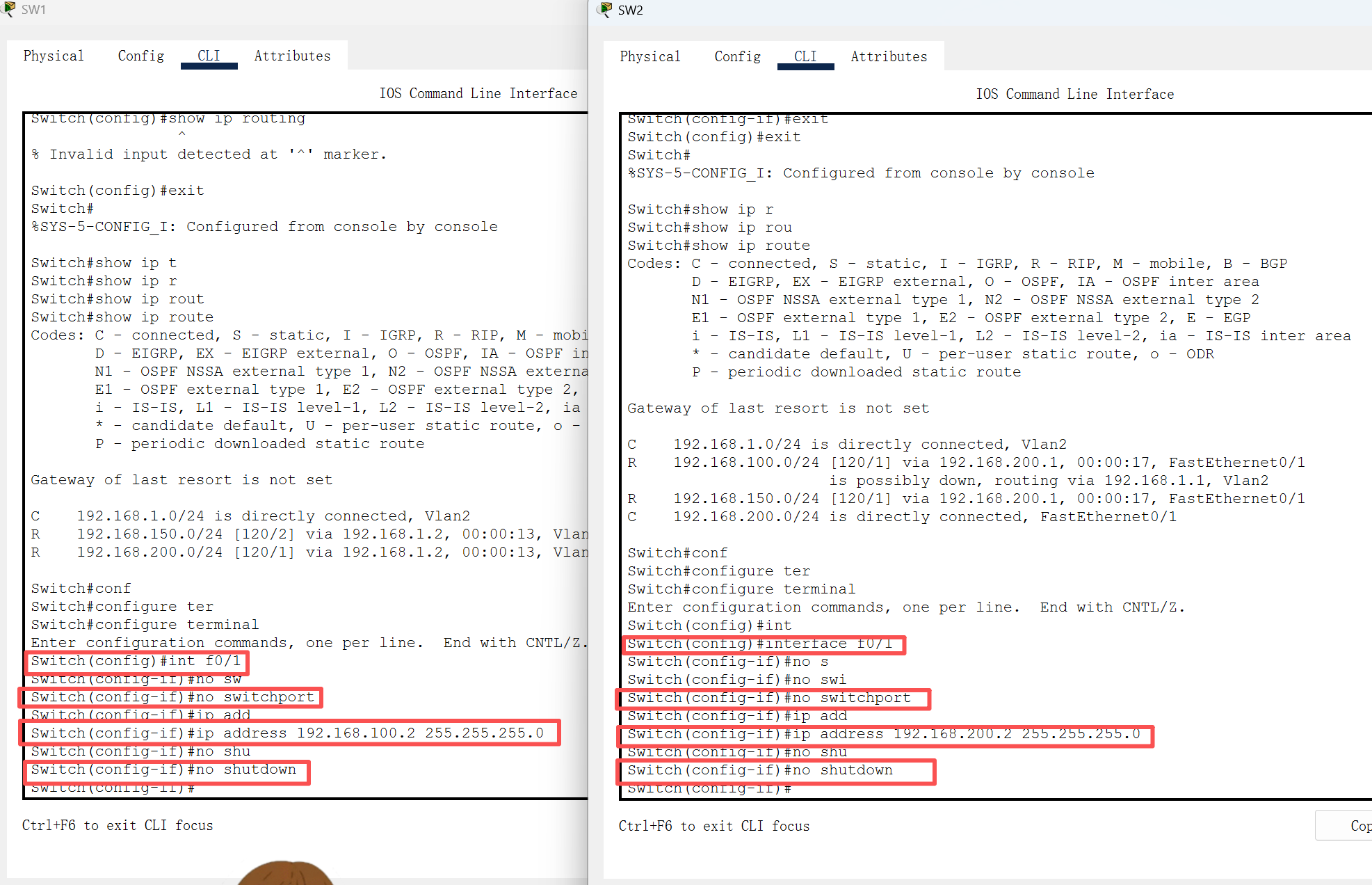 在SW1与SW2上配置路由接口f0/1,并配置接口IP
