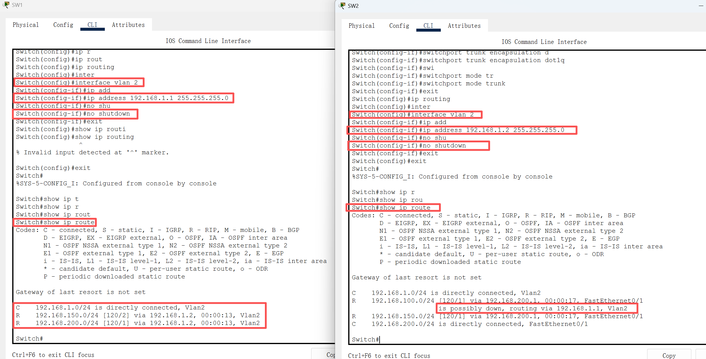 配置SW1与SW2的vlan ip地址,show ip route 查看路由表