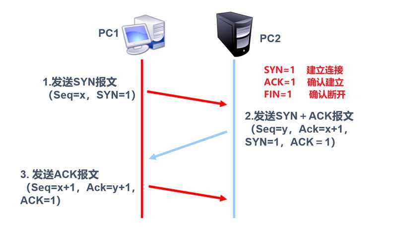 ③PC1向PC2发送ACK报文(Seq=x+1,Ack=y+1,ACK=1)