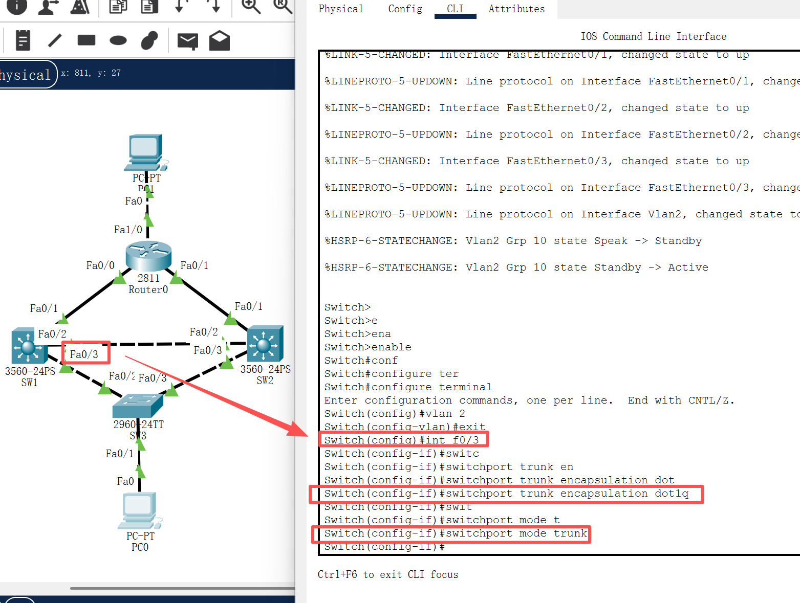 配置SW2的f0/3接口为trunk模式并指定封装方式
