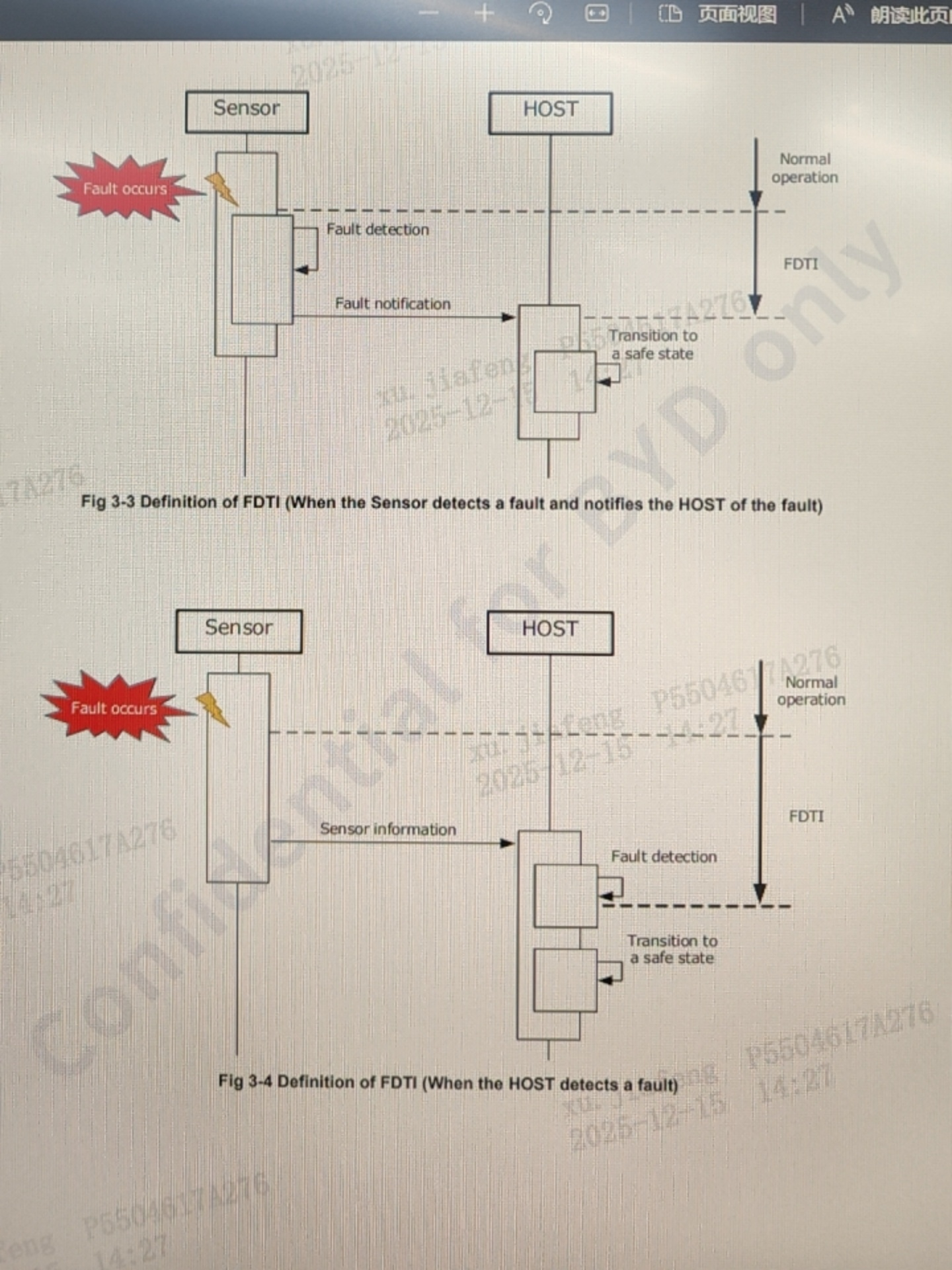 a)FDTI定义:从传感器内部故障发生,到主机开始执行安全状态切换的最长时间间隔。