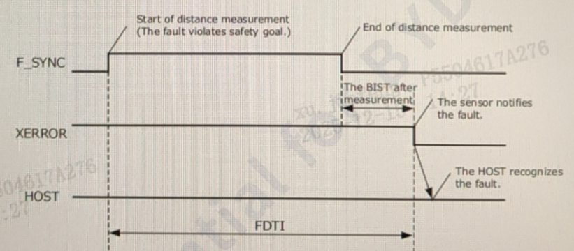 1)传感器在激活状态下,当F_SYNC从高电平切换为低电平时,会执行5项名为运行时BIST的安全机制。使用该传感器的主机需调整 F_SYNC从高到低的时间间隔,确保传感器通过运行时BIST发出的错误通知符合FDTI(故障检测时间间隔)要求。当F_SYNC从低电平切换为高电平时,传感器启动距离测量,因此FDTI的起点是F_SYNC低转高的时刻;FDTI的终点是传感器检测到故障后XERROR状态变化的时刻。若运行时BIST检测到故障,传感器在BIST执行前输出的距离测量数据可能异常(甚至违反安全目标),错误检测后的输出数据也可能异常。主机需通过检查XERROR引脚,判断传感器在FDTI内是否故障;若要确认故障类型,需读取错误状态寄存器。通过EBD的故障通知会在下一次距离测量时完成。