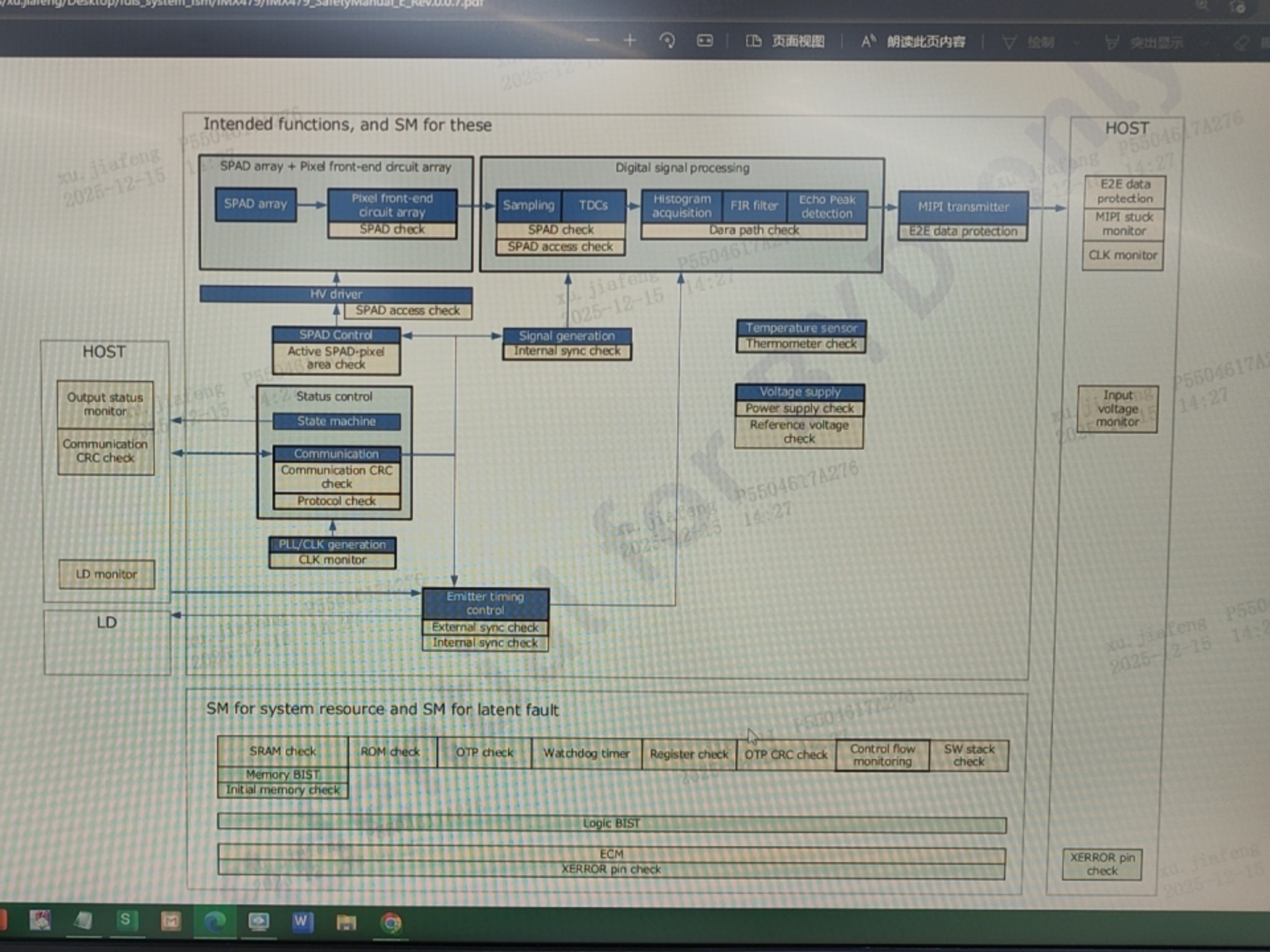 2)针对传感器通用资源(非单一功能)的潜在故障检测,是全局兜底的安全措施,比如:存储类:SRAM/ROM/OTP检查、存储BIST;系统类:看门狗定时器、寄存器检查、控制流监控、软件栈检查;硬件类:逻辑BIST、ECM、XERROR引脚检查。
