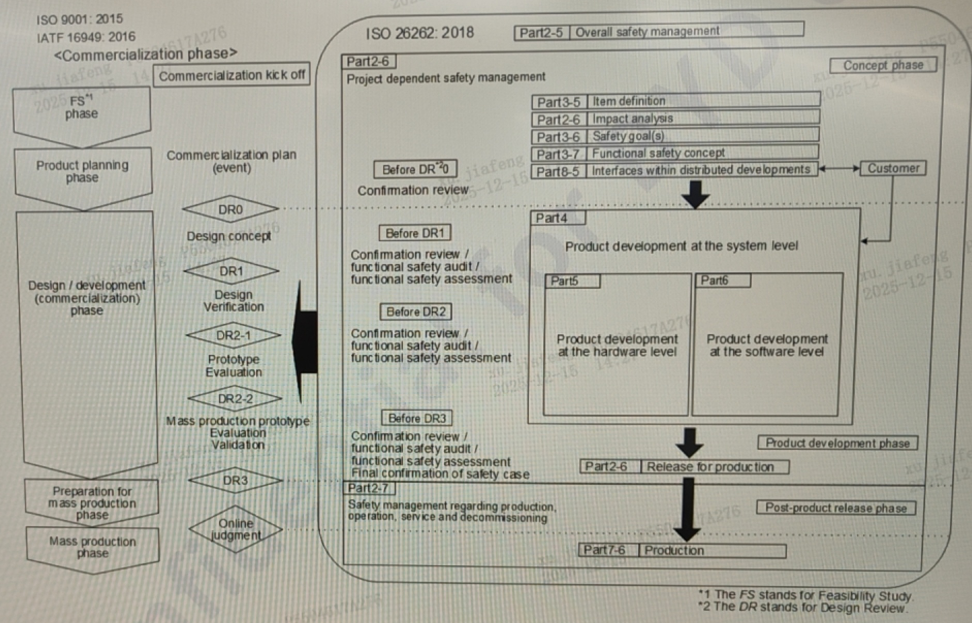 1)左侧是商业化流程(ISO 9001/IATF 16949):按可行性研究(FS)→产品规划→设计开发→量产准备推进,以设计评审(DR0-DR3)为节点,把控商业化各阶段的设计、验证、量产准备工作。