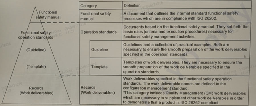 2)操作标准:基于功能安全手册文档,规定了功能安全管理活动所需的基本规则(标准与执行流程);