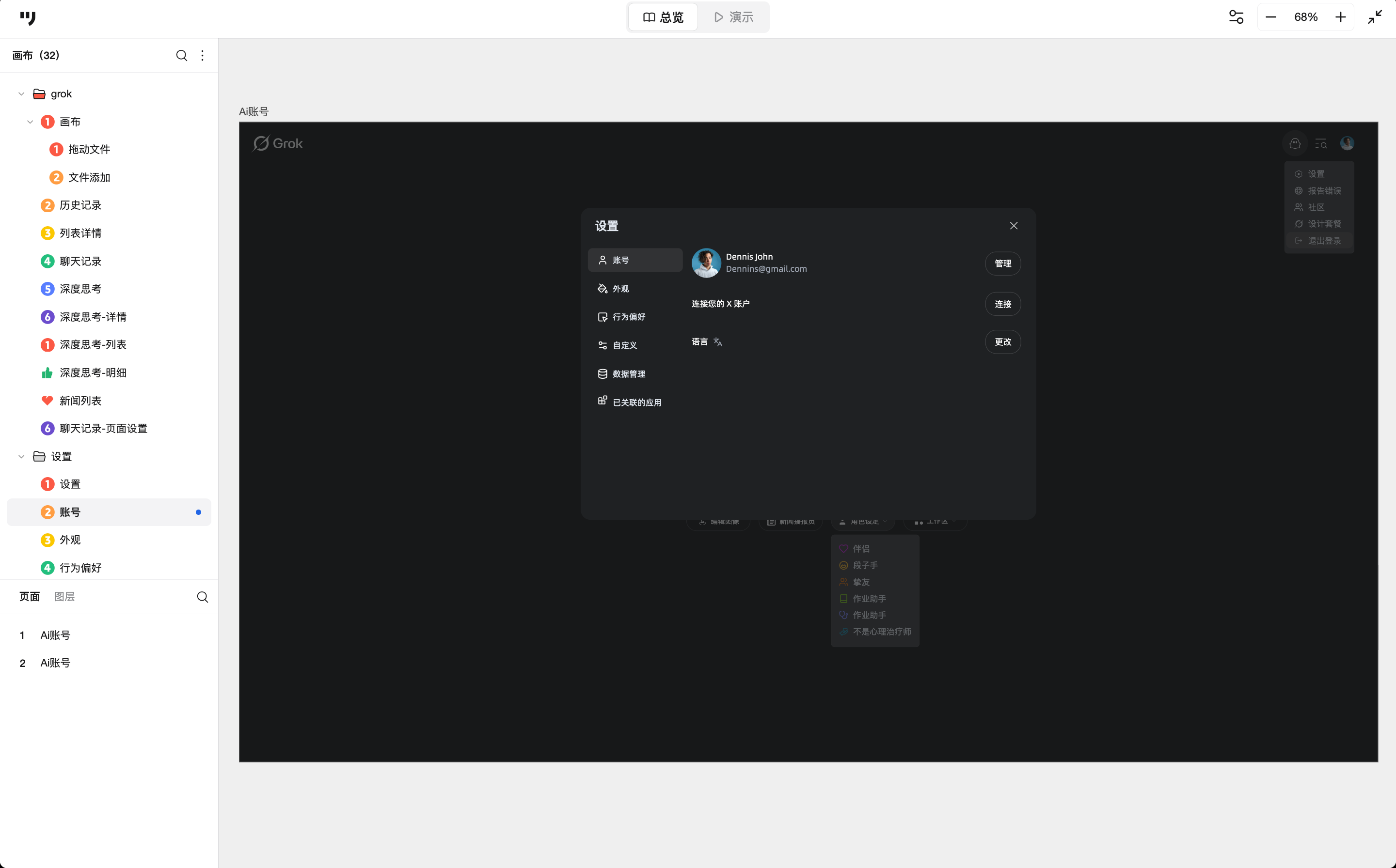 界面右上角头像处有设置入口,采用弹窗的形式呈现,避免跳转打断当前操作。左侧为垂直导航栏,包含:账号、外观、行为偏好、自定义、数据管理、已关联的应用,信息架构一目了然。