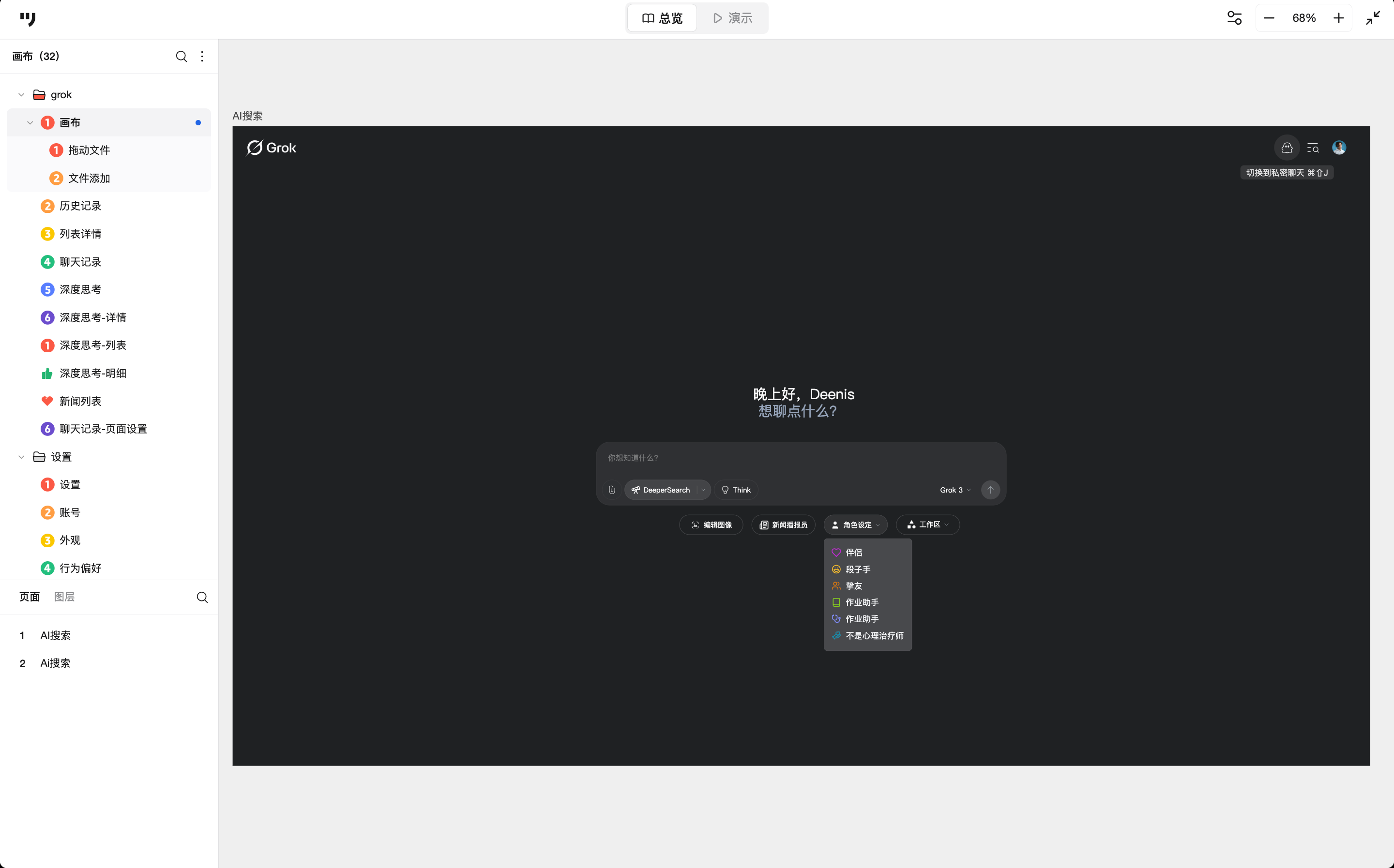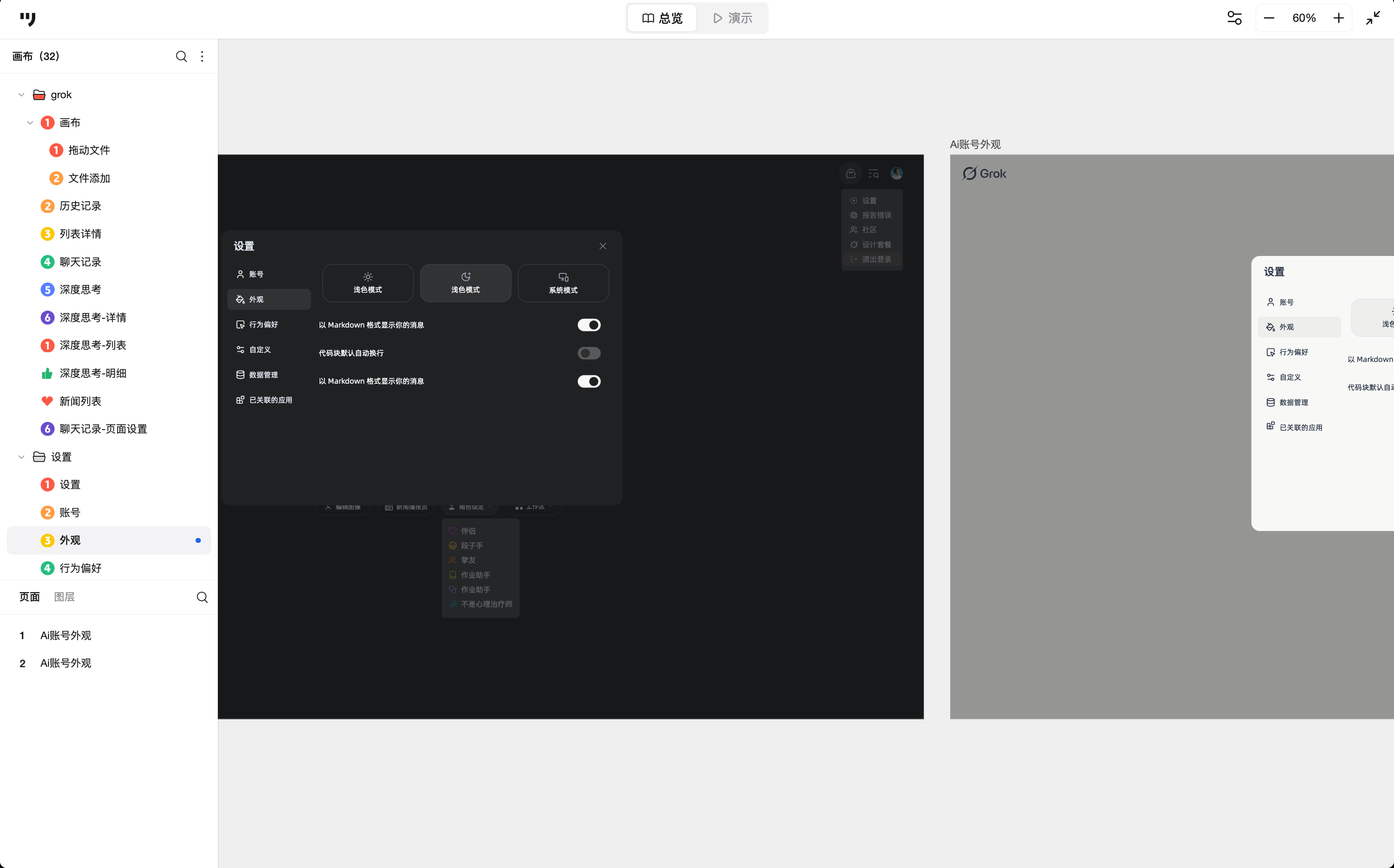 在外观设置中,界面模式分为浅色、深色和系统三种选项。这个案例在原型设计阶段就完整适配了深浅双模式,这一点在细节层级上体现得比较明显。除了这些,还提供了一些偏好选项,例如:是否以 Markdown格式显示消息、代码块默认是否自动换行等,这些设置单看都不大,但基本都是重度用户在用久之后才会在意的细节。